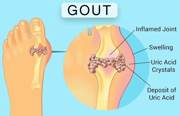 Ideally, uric acid dissolves in the blood and is later disposed of by the kidney through urine. But sometimes, the body either generates too much uric acid or the kidney excrete very little uric acid. As a result, uric acid builds up, forming sharp, needle-like crystals in the joints, fluids, or tissues around the big toe, causing its pain, swelling, and redness.